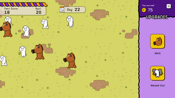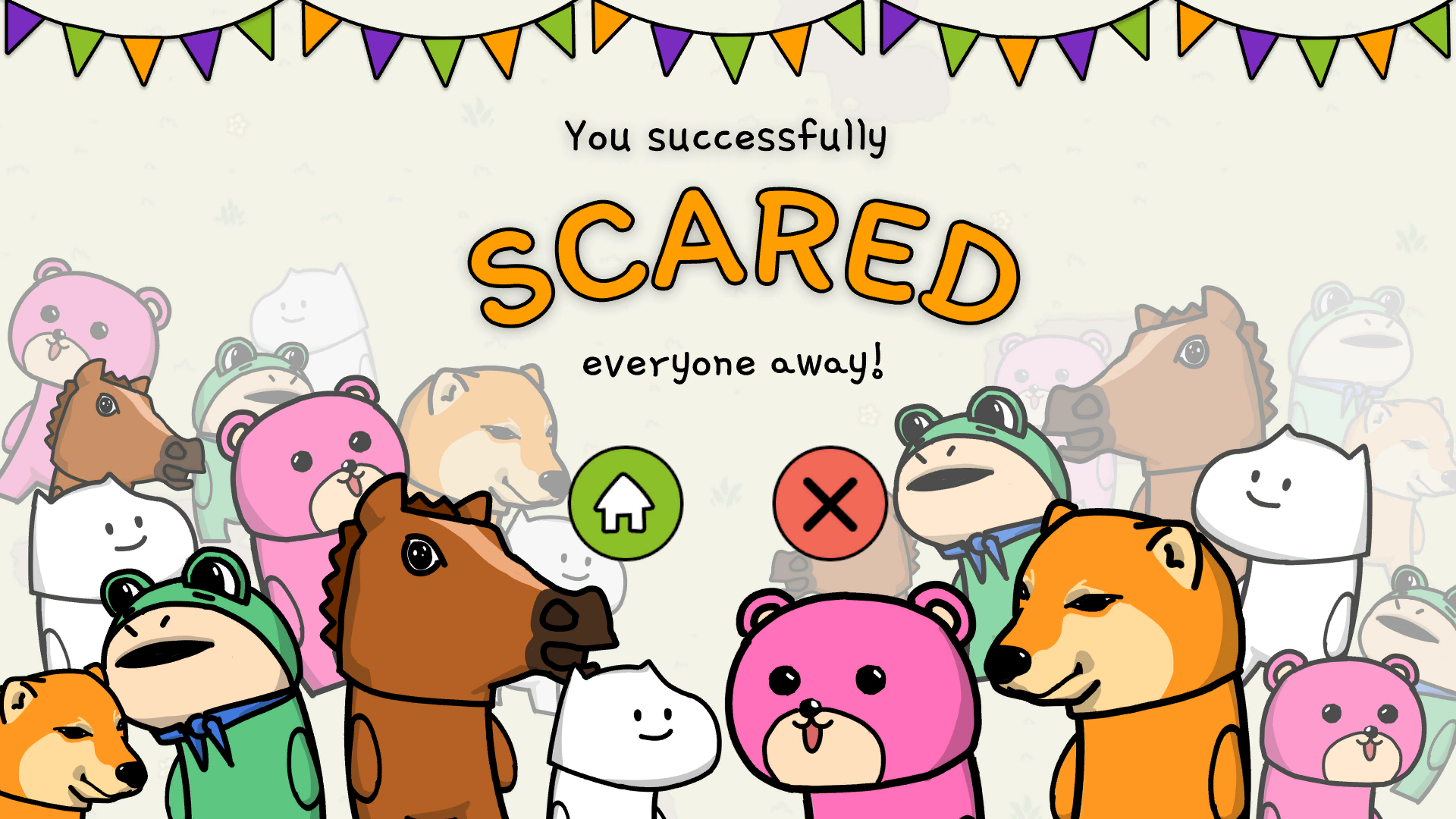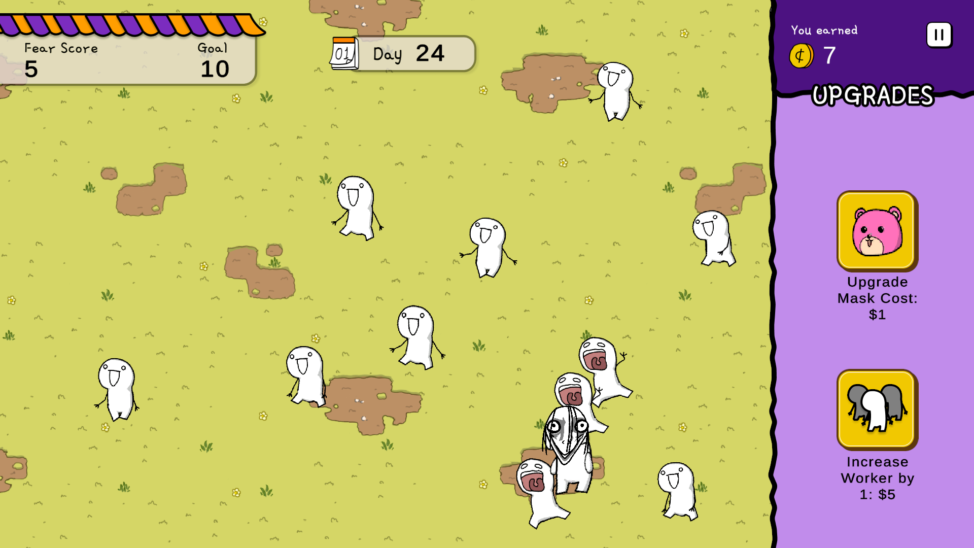 The player plays as a worker in the park to entertain people. They entertain themselves by scaring the customers with a scary mask by clicking on workers, and they gain a fear score. To attract more customers, they walk around in their cute costumes and earn money. They can buy more masks and hire more workers with the money. To win the game, they need to reach the goal before the month ends.